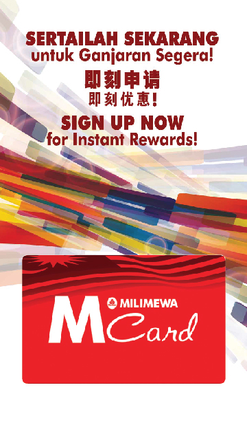Simply present your MCard while you shop at Milimewa outlets, collect 1 reward point for every RM2.00 spend.